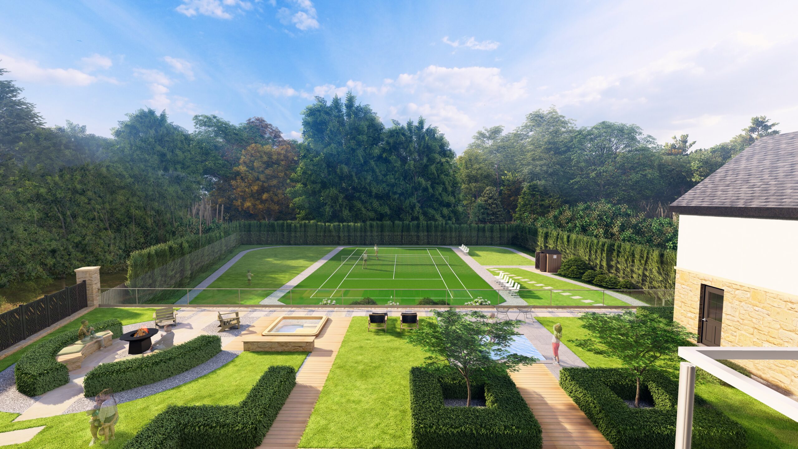 - Photorealistic 3D garden renderings showing materials, textures, and planting