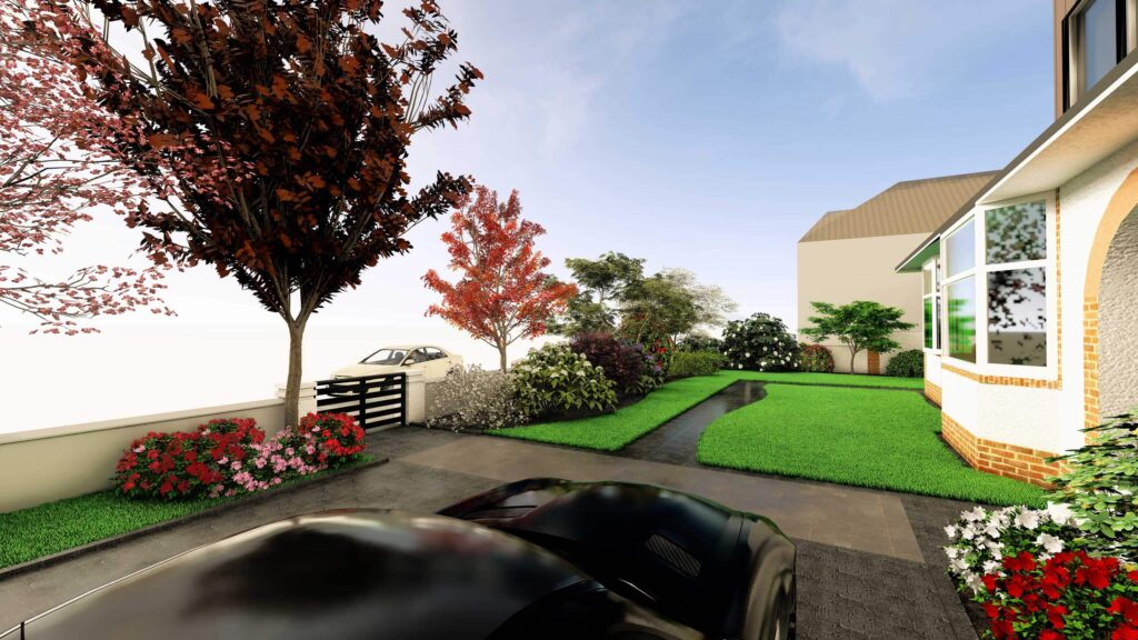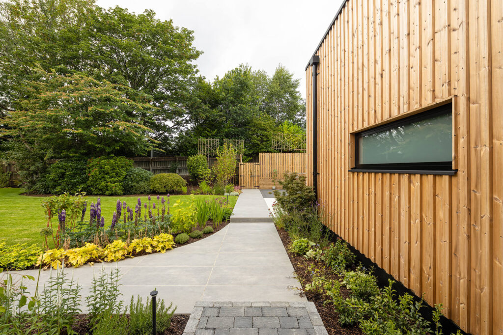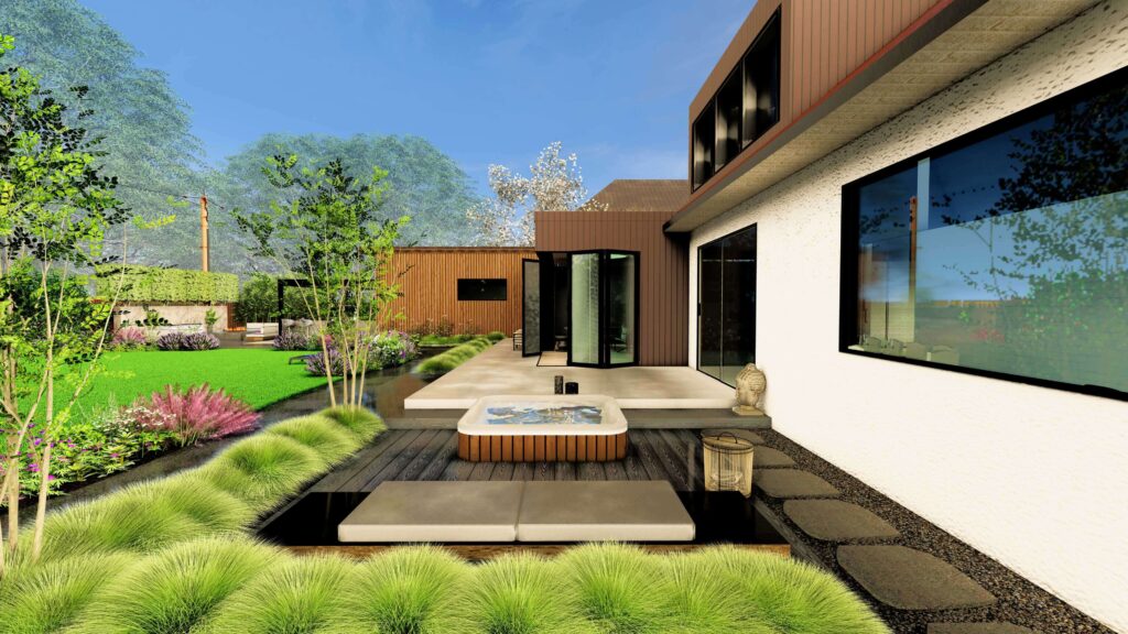 The large glass doors of the house provide direct access to a patio set at the same level as the Datum, ensuring a seamless transition between indoor and outdoor spaces. This space will work as a relaxation space with a Hot Tub and will be interpreted as a continuation of the house, integrated with evergreen planting waves and splashes of blooming perennials, and will bring a seamless walk-through from the front terrace to the garden.