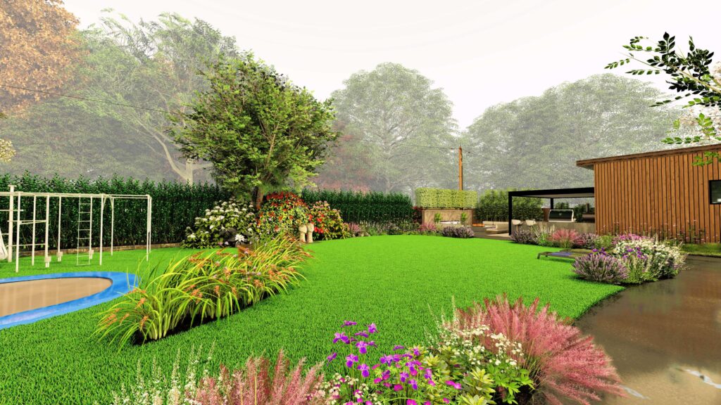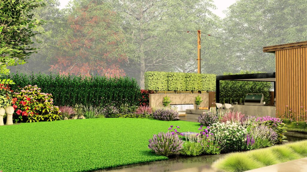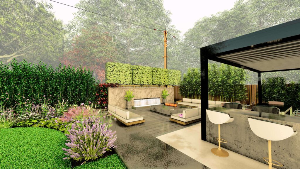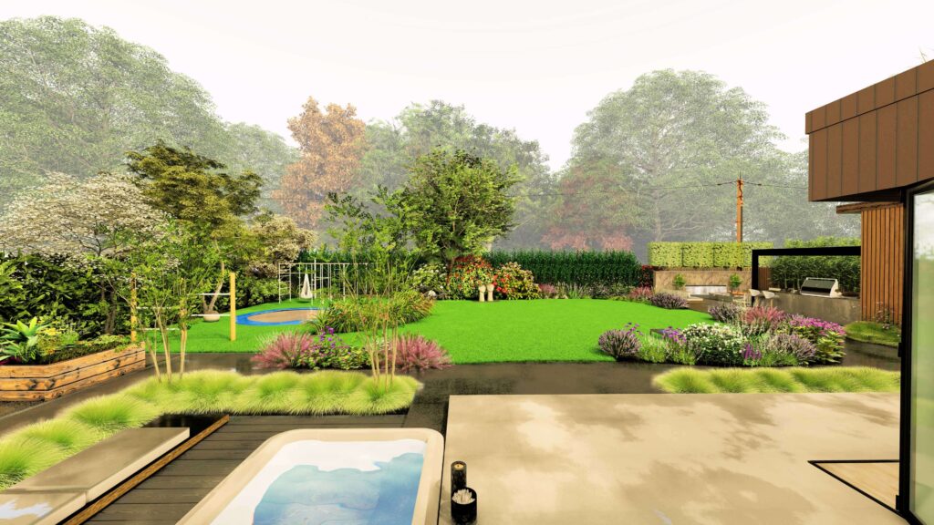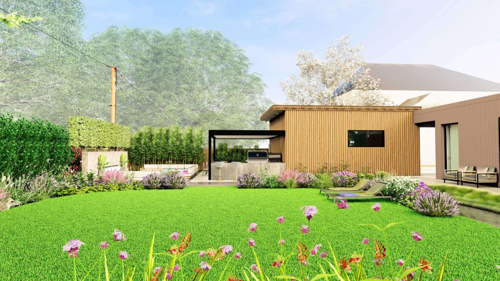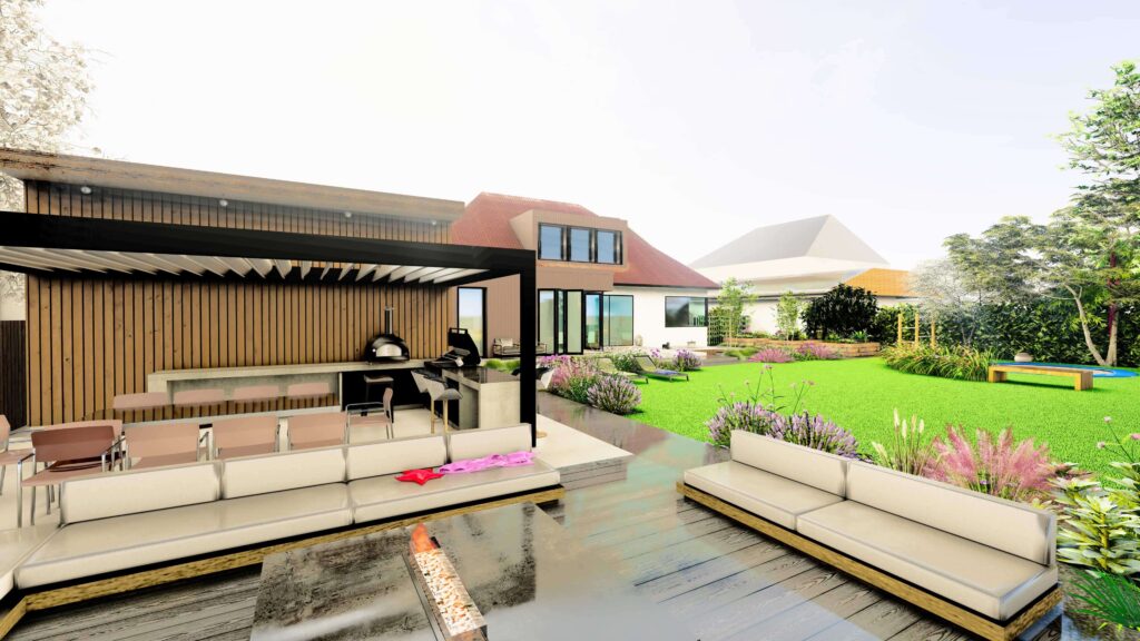 This generous patio forms the central hub of the garden, featuring a comfortable lounge area, a dining space for up to eight people, and an outdoor kitchen. The lounge, set on a composite or timber deck, provides a relaxed setting to unwind while offering a seamless transition into the surrounding garden. Its position also allows the clients to enjoy the space while keeping an eye on their children playing nearby. This area is designed to offer an unforgettable experience for family and friends’ gatherings and dining Al fresco.