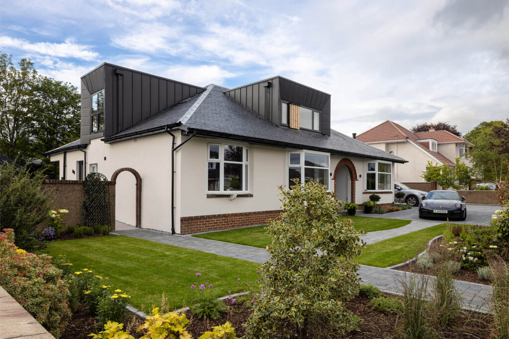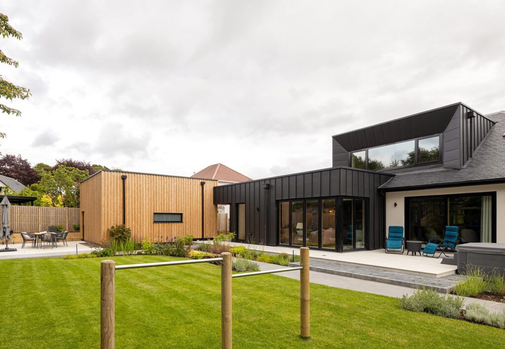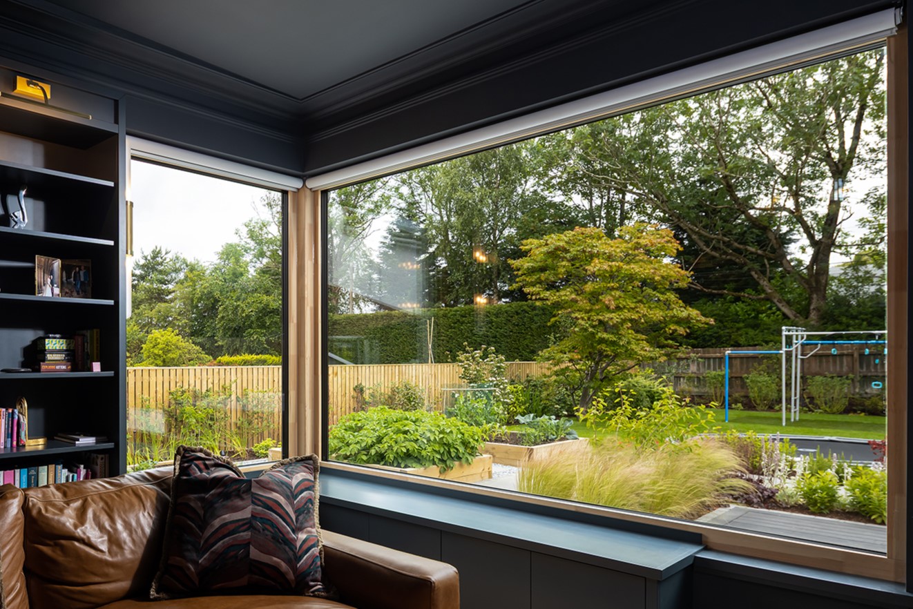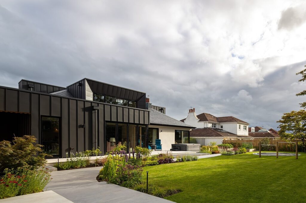 The property is in Glasgow, and it was just purchased in order to be extended into a place of peace, relaxation and entertainment by creating a high-quality indoor and outdoor space that the whole family and friends could use. The heart of the house is on the ground floor: everyday life takes place in the living and dining area. Characteristic of this area are the generous frameless sliding window/doors elements, which bring the outside space into the house and highlight the visual axes. The L-shaped new house’s extension allows the kitchen and living room to coexist together without physically separating the rooms from each other and at the same time further enhances the open living feeling.