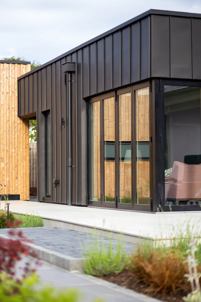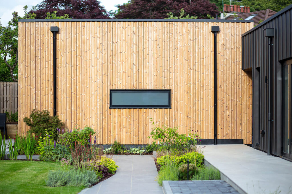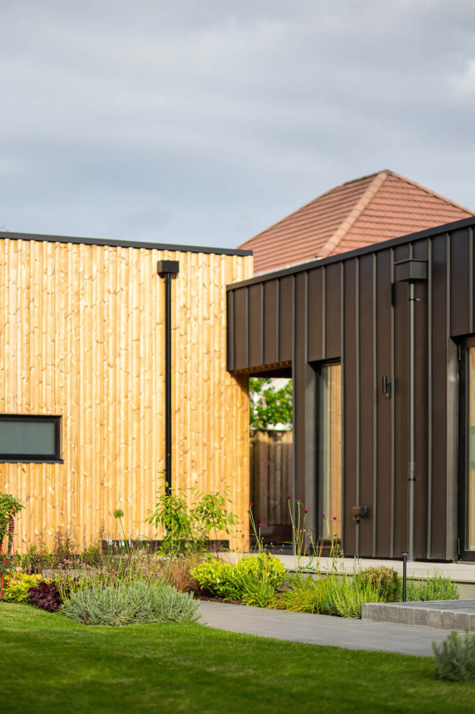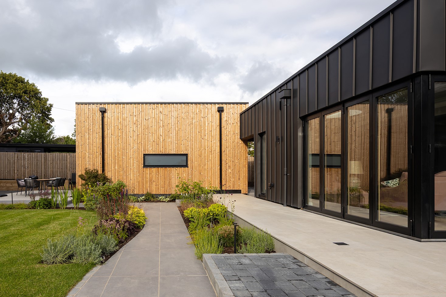 On the adjacent side of the house, a Kitchen Garden was designed with 3 raised beds as well as a dog area divided by vertical battens metal screening in the same style as the new house’s extension and the garage.